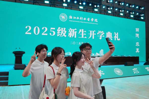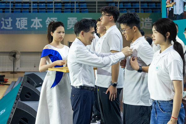 校党委书记钱天国为新生代表佩戴校徽。自此,全体2025级新生正式成为水院共同体的重要组成部分。