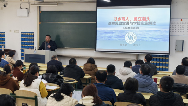 教务处万军作题为《以水育人、勇立潮头,课程思政宣讲与学校实施解读》专题报告。万军结合丰富的教务管理经验和教学实践,系统阐释了课程思政的内涵要求与实践路径。报告紧扣省委巡视指导意见,贴合学校应用型人才培养实际,为教师提供了清晰的理论指引和可操作的实践方案。