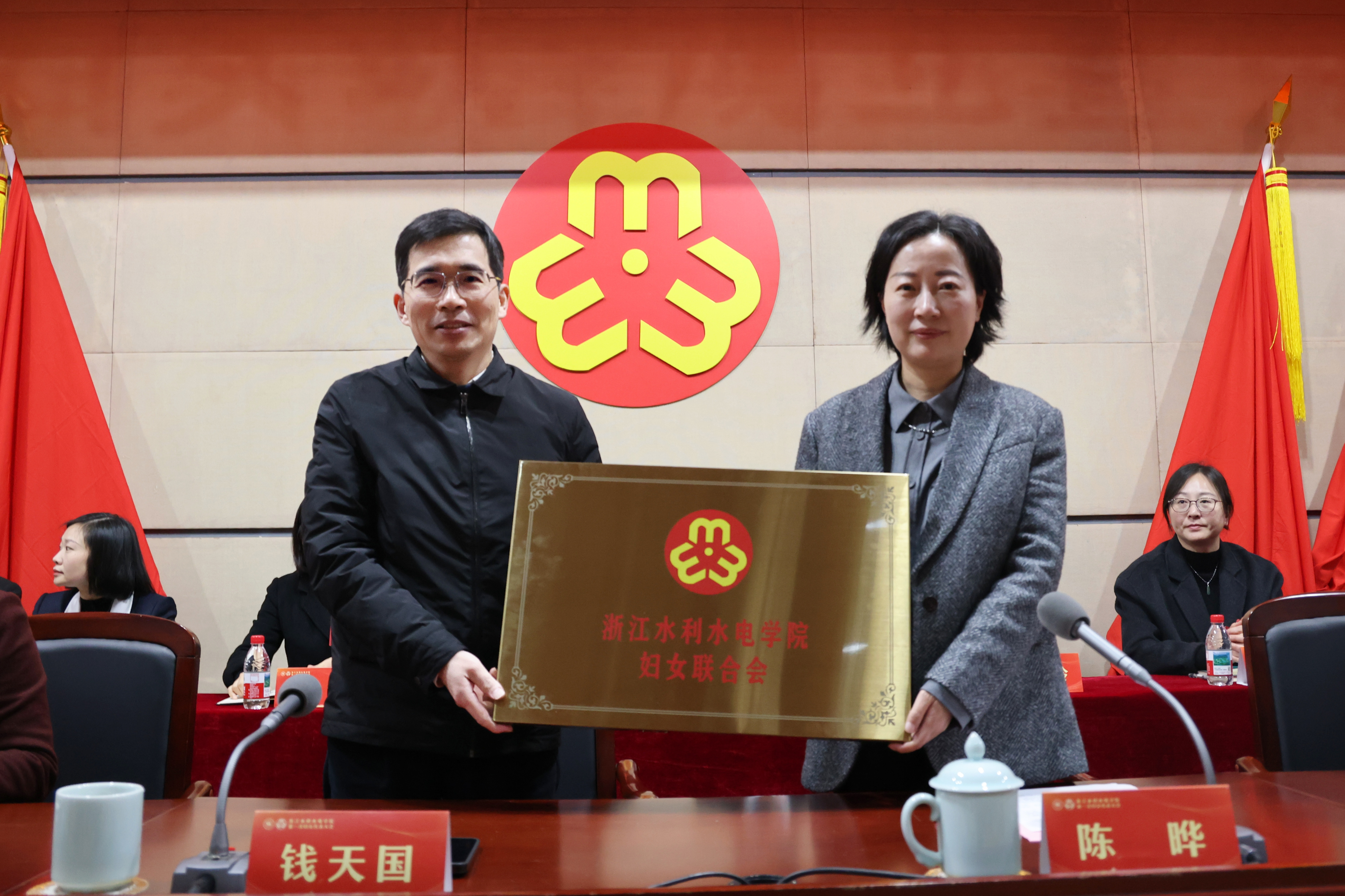 陈晔为学校妇女联合会授牌,钱天国代表学校接牌。
