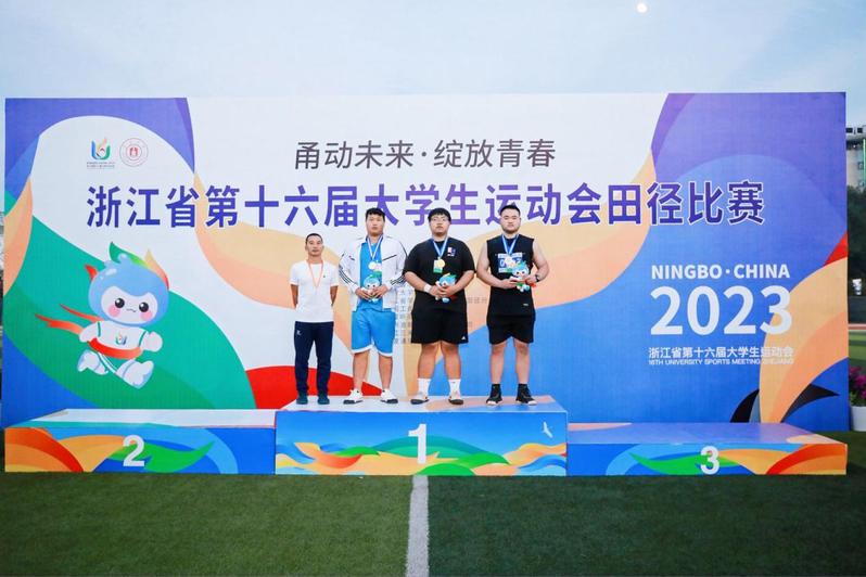 During the first day’s high jump event, Hu Feng, a student from the College of Geomatics and Municipal Engineering, claimed the championship and set a new university record, securing the first gold medal for ZJWEU. Meanwhile, Yang Xiao, a student from the College of Economics and Management, took first place in the shot put event, securing the second gold medal for ZJWEU.