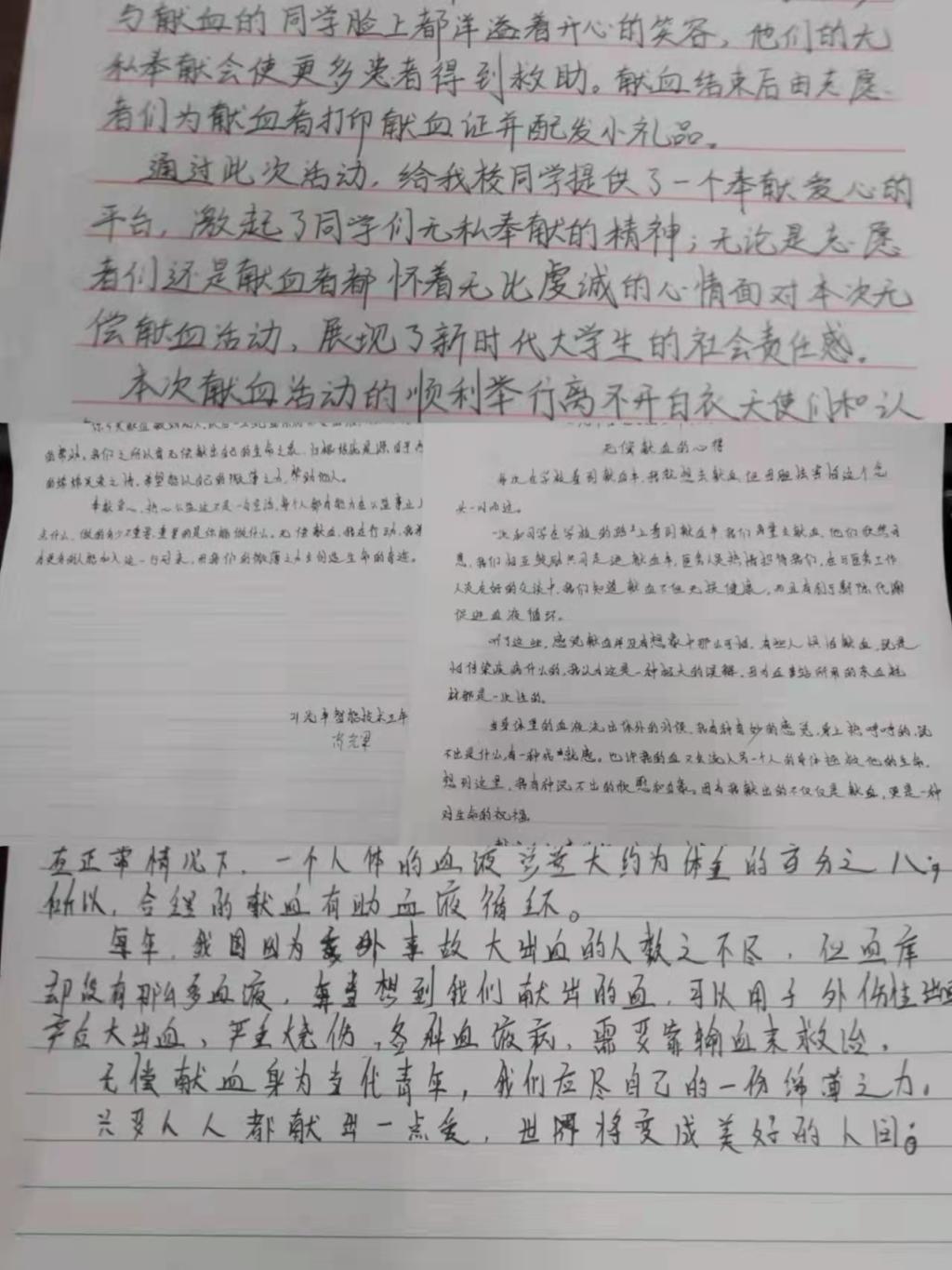 参加完献血活动的同学们把献血后自己最真挚的感想写在了纸上,“一个人献血是有限的,无偿献血需要大家搭把手”“每一次伸手都意义非凡”,体现了同学们对新时代志愿者精神的弘扬,让雷锋精神在校园里延续和升华,同时,同学们都在用自己的实际行动,向社会传递着爱与感动、传递着更多向上、向善的力量。