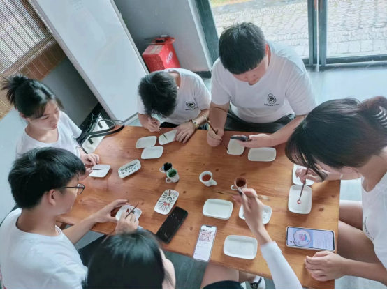 拉坯环节结束后,来到瓷上釉阶段,大家充分发挥创意,将现代元素与传统吉州窑相结合,赋予作品新的生命力。志愿者们或低头沉思,或轻轻地在陶器上勾勒线条。草图逐渐成形,有的简约而富有意境,有的复杂而精致入微,每一笔都承载着创作者的情感与故事。