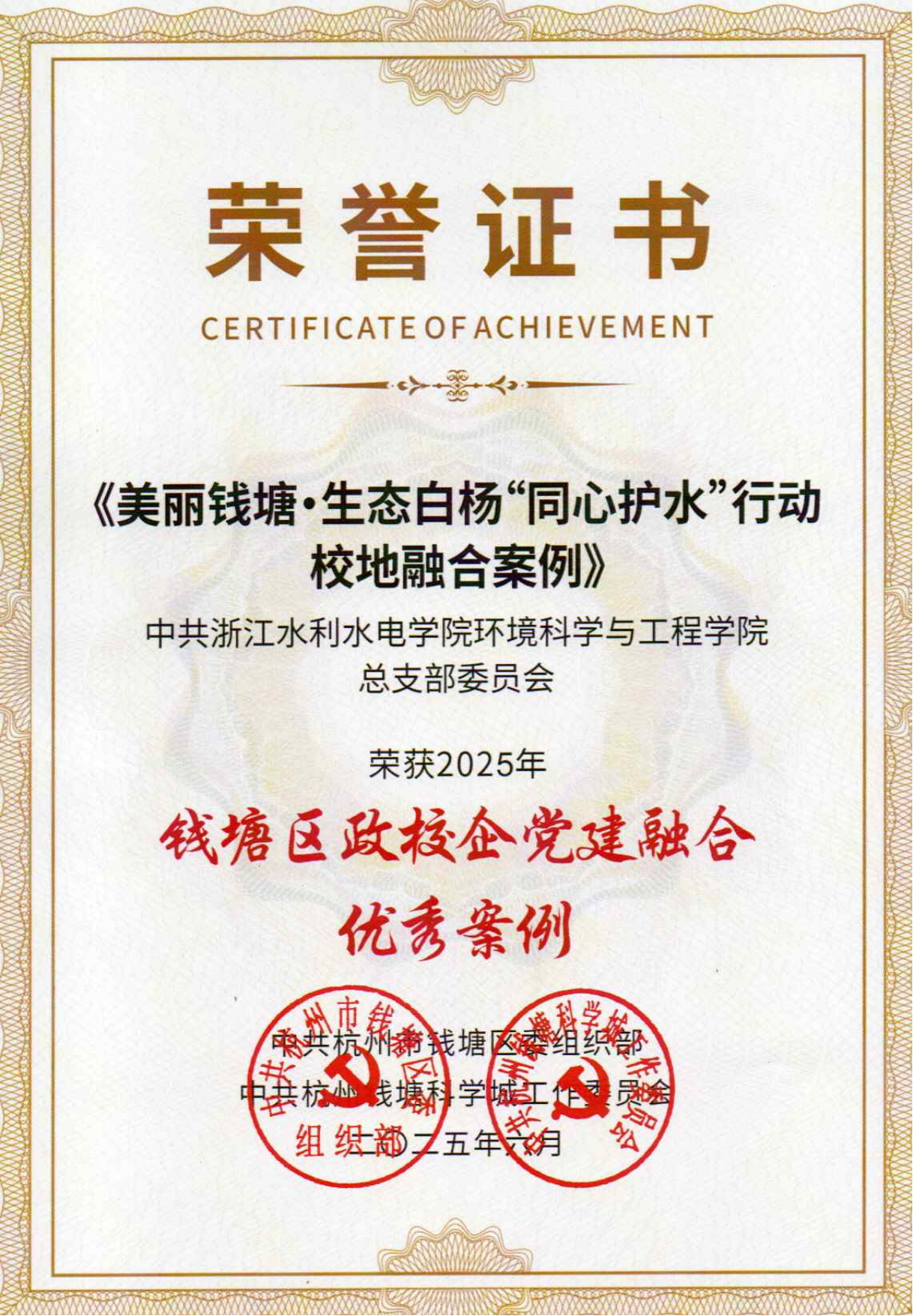 近日,杭州市钱塘区2025年政校企党建融合优秀案例评选结果揭晓,环境学院“美丽钱塘・生态白杨‘同心护水’行动校地融合案例”成功入选。