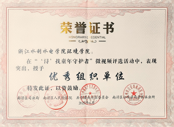 为深入宣传贯彻《浙江省未成年人保护条例》,积极发挥属地高校思政引领作用,营造全社会关爱保护未成年人健康成长的浓厚法治氛围,近日,环境学院积极承办由南浔区司法局、区检察院、团区委、区公安分局景区派出所联合主办的“‘浔’找童年守护者”微视频大赛,水院学子凭借出色表现,斩获佳绩,环境学院获评优秀组织单位。