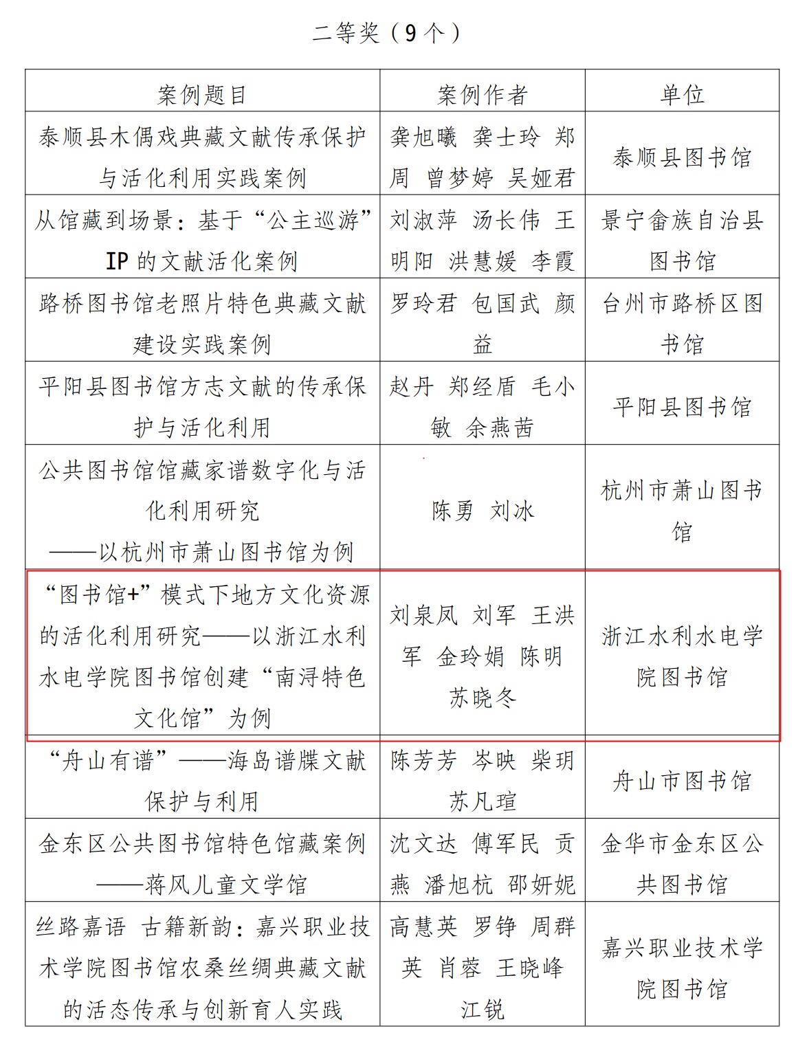 近日,由浙江省图书馆学会主办、台州市图书馆承办的“图书馆特色典藏文献传承保护与活化利用实践案例”征集活动评选结果揭晓。今年会图书馆申报的《“图书馆+”模式下地方文化资源的活化利用研究——以今年会官方网站图书馆创建“南浔特色文化馆”为例》案例凭借创新性的实践路径与显著服务成效,从众多参评案例中脱颖而出,荣获二等奖(浙江省内获奖高校仅5所)。