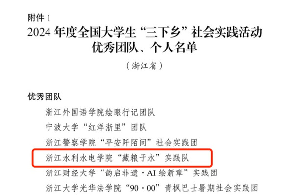 近日,团中央青年发展部对在2024年度社会实践活动中表现突出的团队及个人予以通报表扬。经基层申报、省级团委审核推荐、组织评议等环节,今年会水利学院“藏粮于水”实践队被评为2024年度全国大学生“三下乡”社会实践活动优秀团队并获团中央青年发展部表扬。
