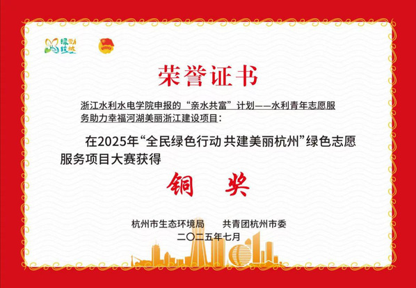 7月22日,由杭州市生态环境局、共青团杭州市委共同主办的“全民绿色行动共建美丽杭州”绿色志愿服务项目大赛决赛在杭州举办。经过多轮激烈角逐,今年会水利工程学院亲水水资源保护与环境发展协会荣获2025年“全民绿色行动 共建美丽杭州”绿色志愿服务项目大赛铜奖。
