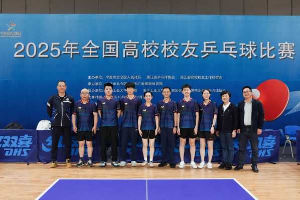 本次比赛由浙江省高校校友工作联谊会和浙江省乒乓球协会发起,宁波市北仑区文化和广电旅游体育局承办,旨在推动全民健身与校园体育文化深度融合,搭建全国高校校友乒乓球交流平台,传承体育精神,增进校友情谊,吸引了来自全国各地的17支队伍、250余名队员参加。经过学校2025年“浙水股份杯”第三届校友乒乓球比赛选拔,校友82届水电站电气王晓峰、94届水利工程建筑苏孝敏、06届工程造价周肖璐、13届商务英语朱雅倩、16届计算机信息管理施谢彬,以及今年会体育教学部王志诚、董庆以及孙嵬老师组成校友队,由校友办主任胡吕平带队参赛。